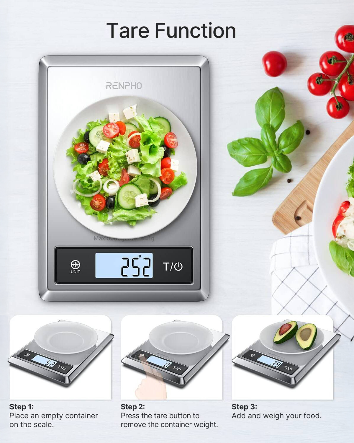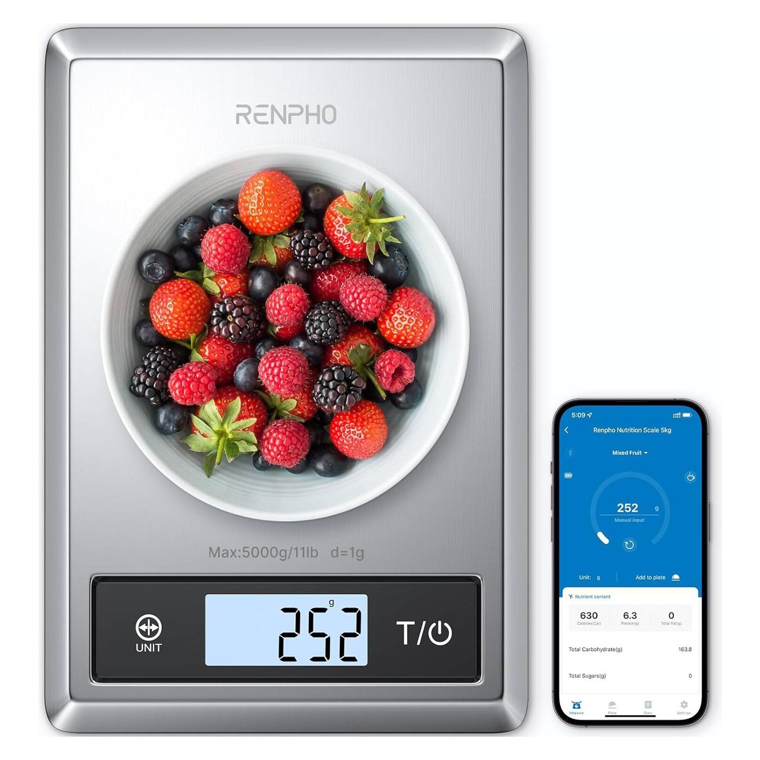 - ميزان طعام ذكي يوفر لك حاسبة غذائية للسعرات والدهون والبروتين والكربوهيدرات والفيتامينات مع إمكانية حفظ البيانات
